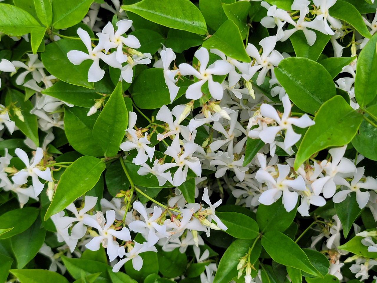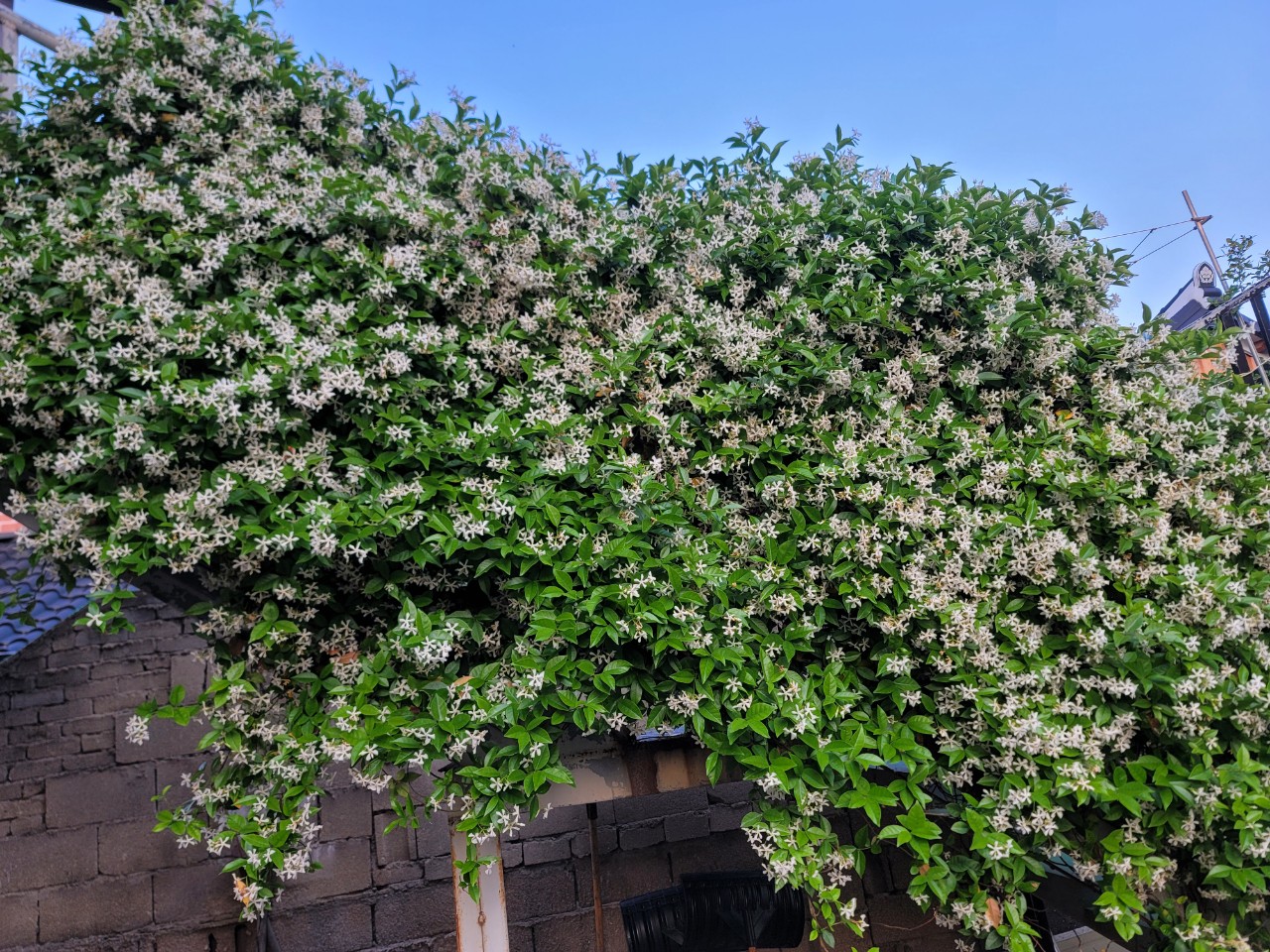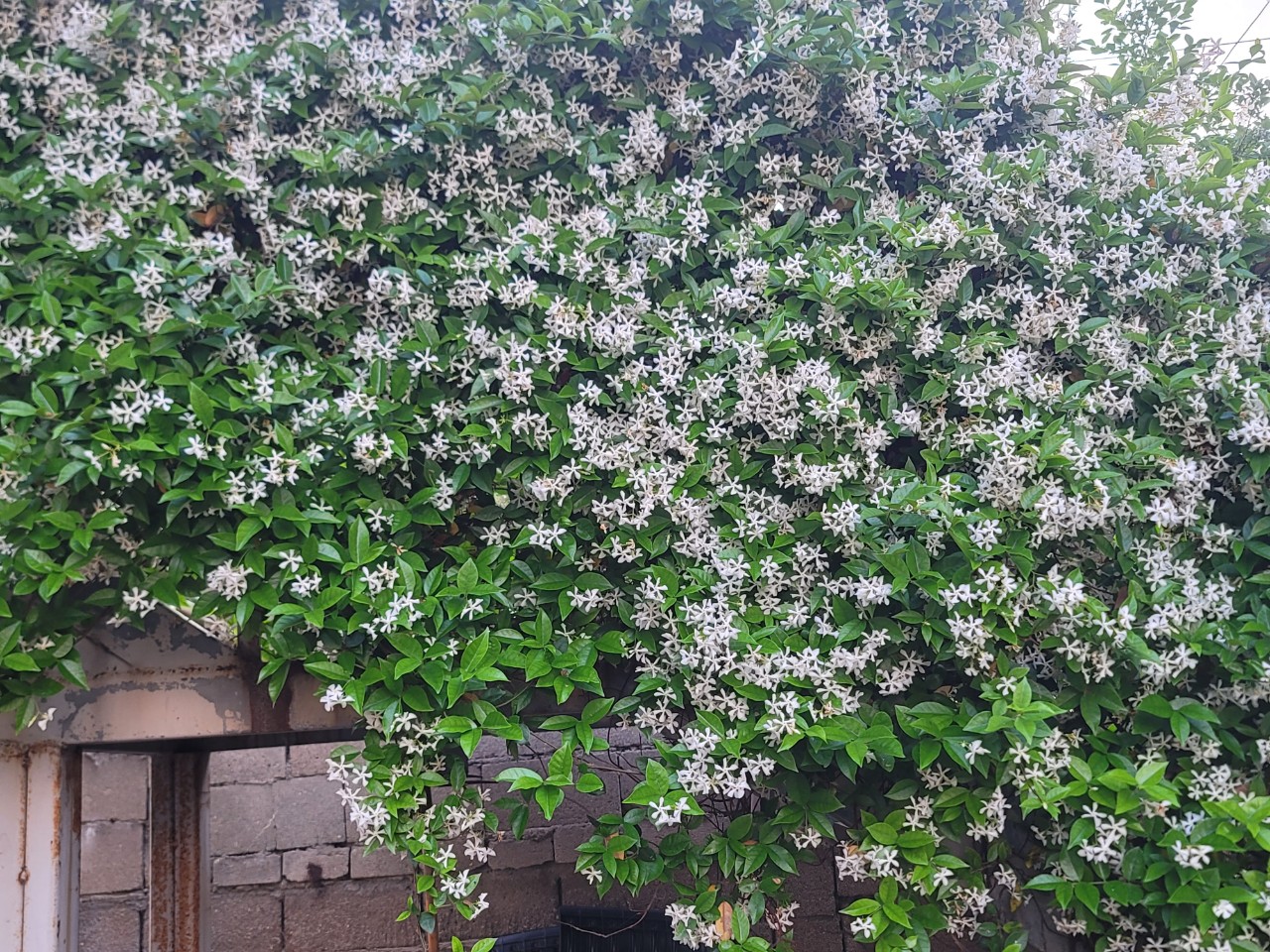 집에 있는 학자스민이 계단 난간을 타고 자라 꽃이 만개하여 향기를 내고 있다.