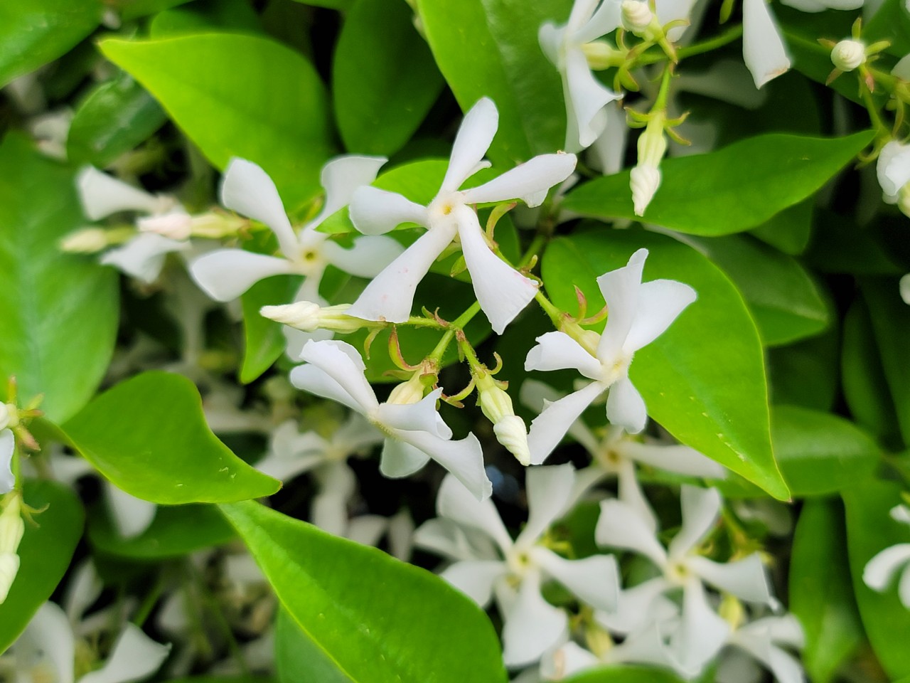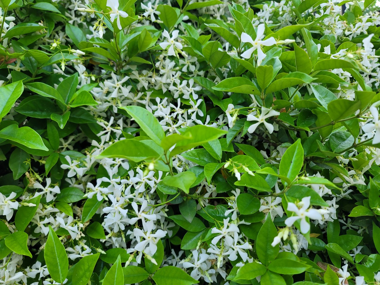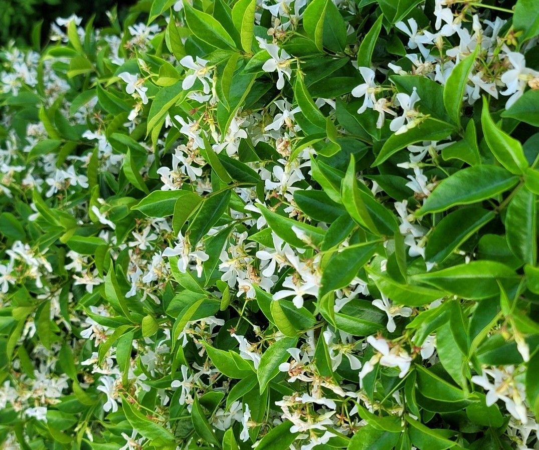 집에 있는 학자스민이 계단 난간을 타고 자라 꽃이 만개하여 향기를 내고 있다.