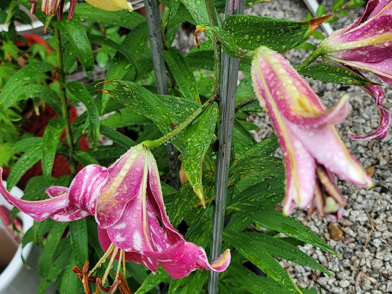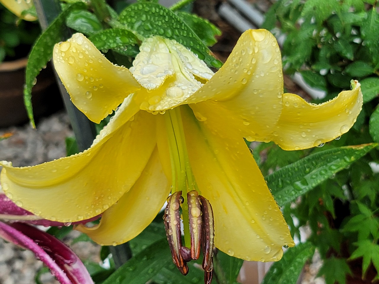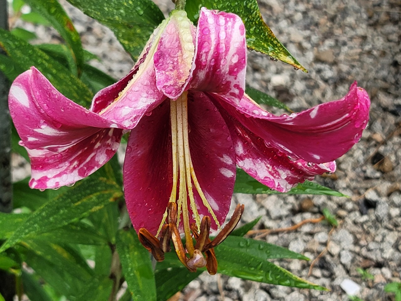 5~6월에 깔때기 모양의 흰 꽃이 원줄기 끝에 2~3개 달려 옆을 향해 벌어져서 피는데 향기가 강하다. 통 부분이 나팔처럼 벌어지고 6개인 꽃덮이 조각은 서로 떨어져 나는데 길이 12~16cm의 거꾸로 된 댓잎피침형이다. 바깥 꽃덮이 조각은 뒷면의 가운데 세로맥이 튀어나오고 다소 녹색이 돌며 위쪽이 약간 뒤로 젖혀진다. 수술은 6개인데 꽃덮이보다 짧으며 황색의 꽃밥이 T자 모양으로 달린다.