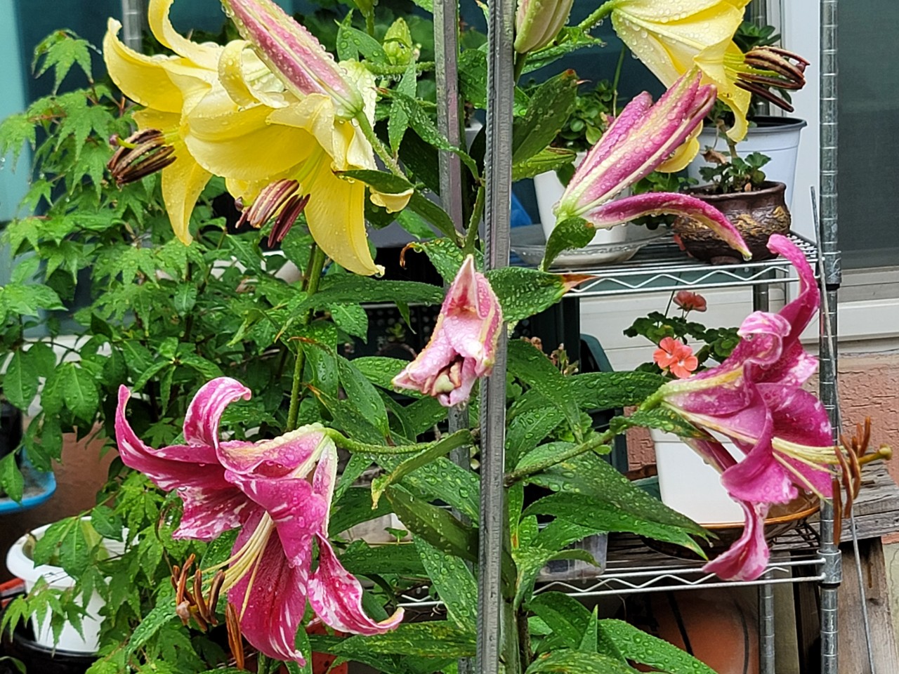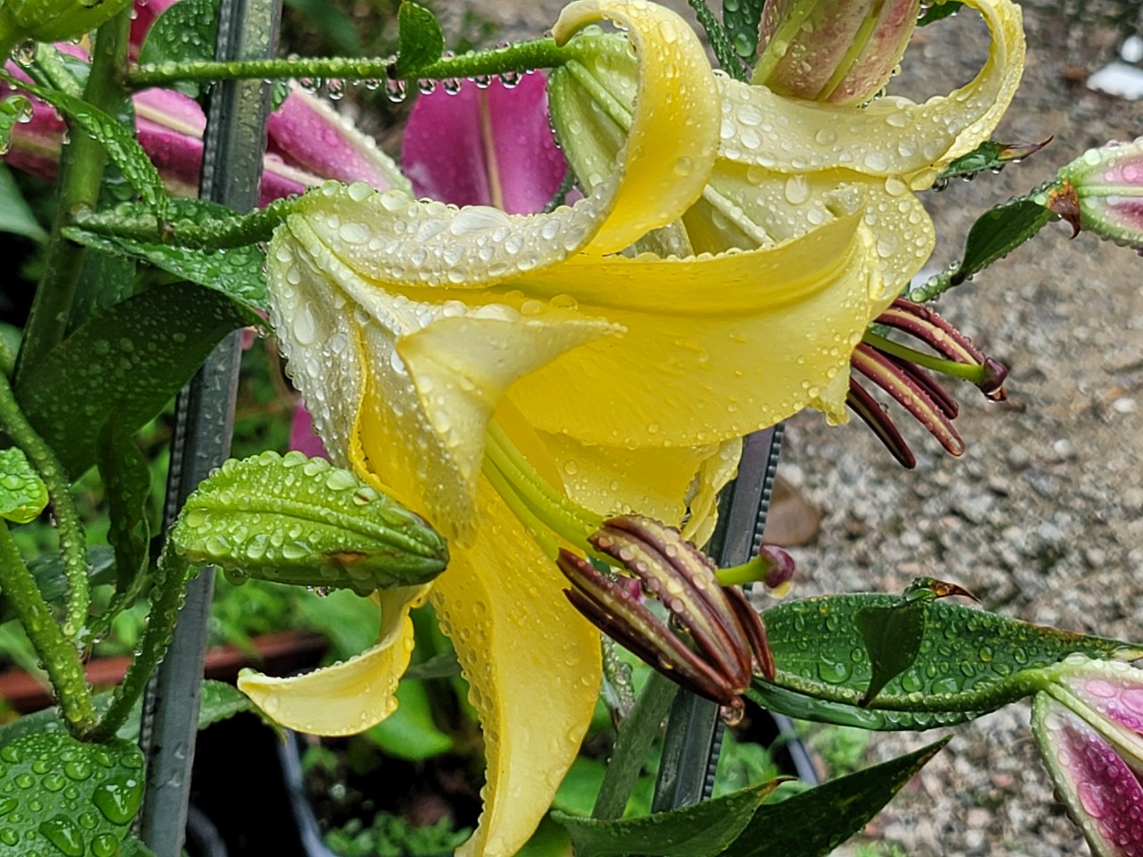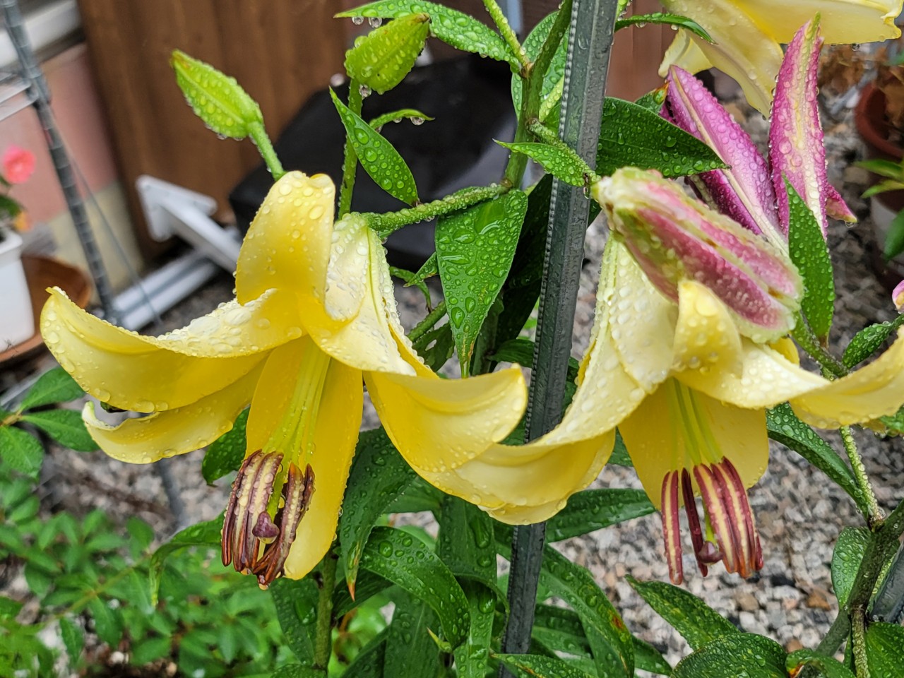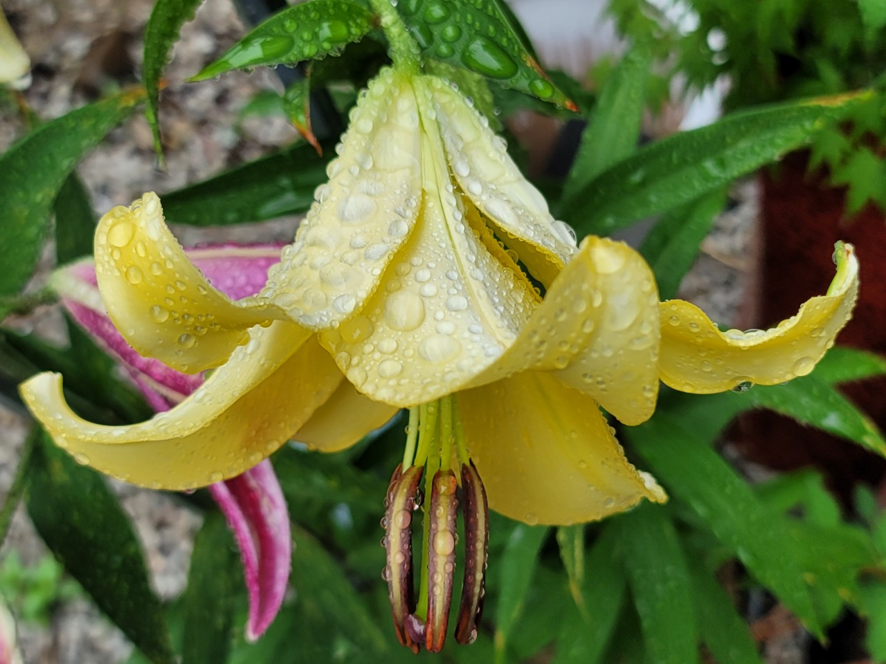 5~6월에 깔때기 모양의 흰 꽃이 원줄기 끝에 2~3개 달려 옆을 향해 벌어져서 피는데 향기가 강하다. 통 부분이 나팔처럼 벌어지고 6개인 꽃덮이 조각은 서로 떨어져 나는데 길이 12~16cm의 거꾸로 된 댓잎피침형이다. 바깥 꽃덮이 조각은 뒷면의 가운데 세로맥이 튀어나오고 다소 녹색이 돌며 위쪽이 약간 뒤로 젖혀진다. 수술은 6개인데 꽃덮이보다 짧으며 황색의 꽃밥이 T자 모양으로 달린다.