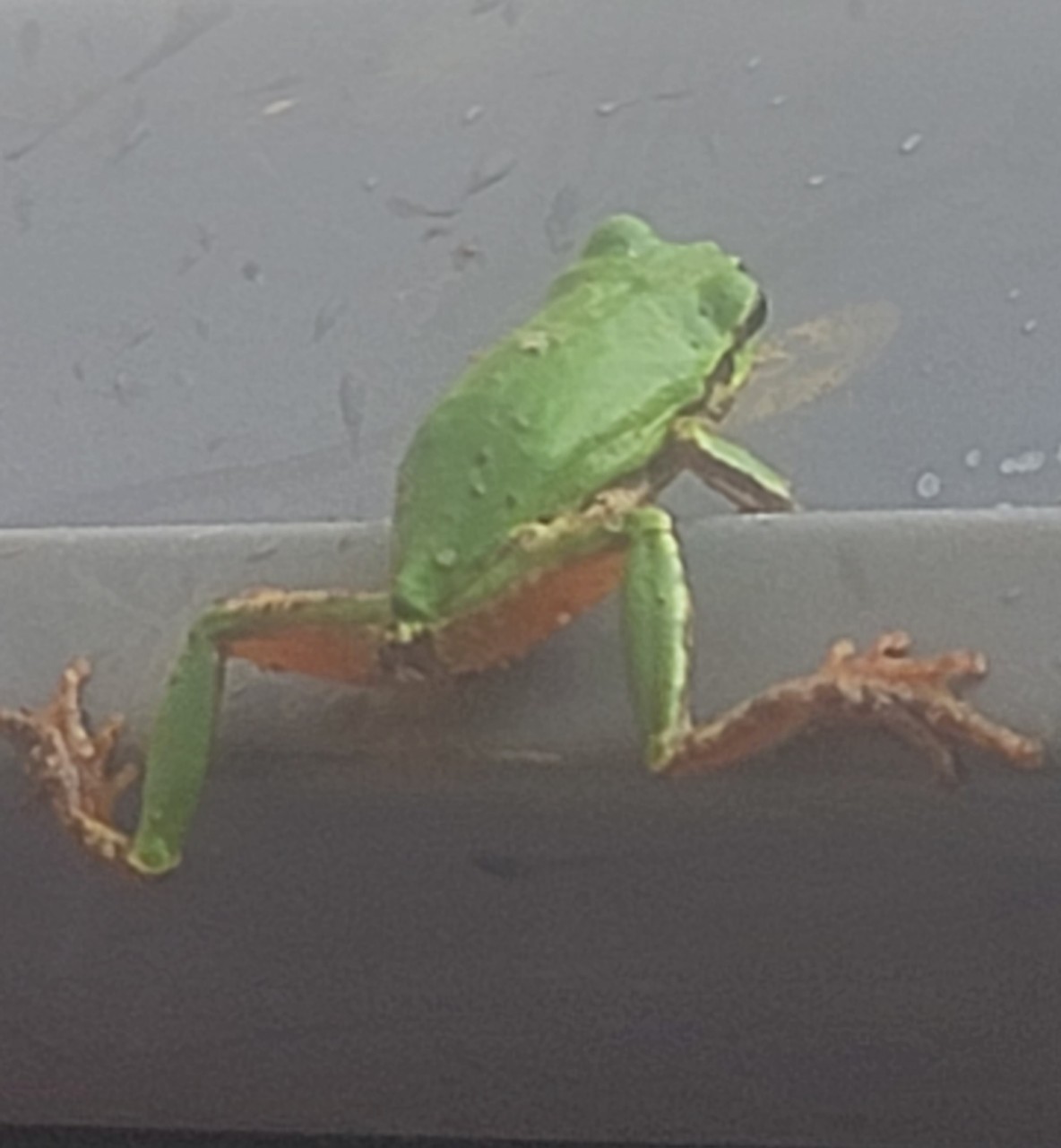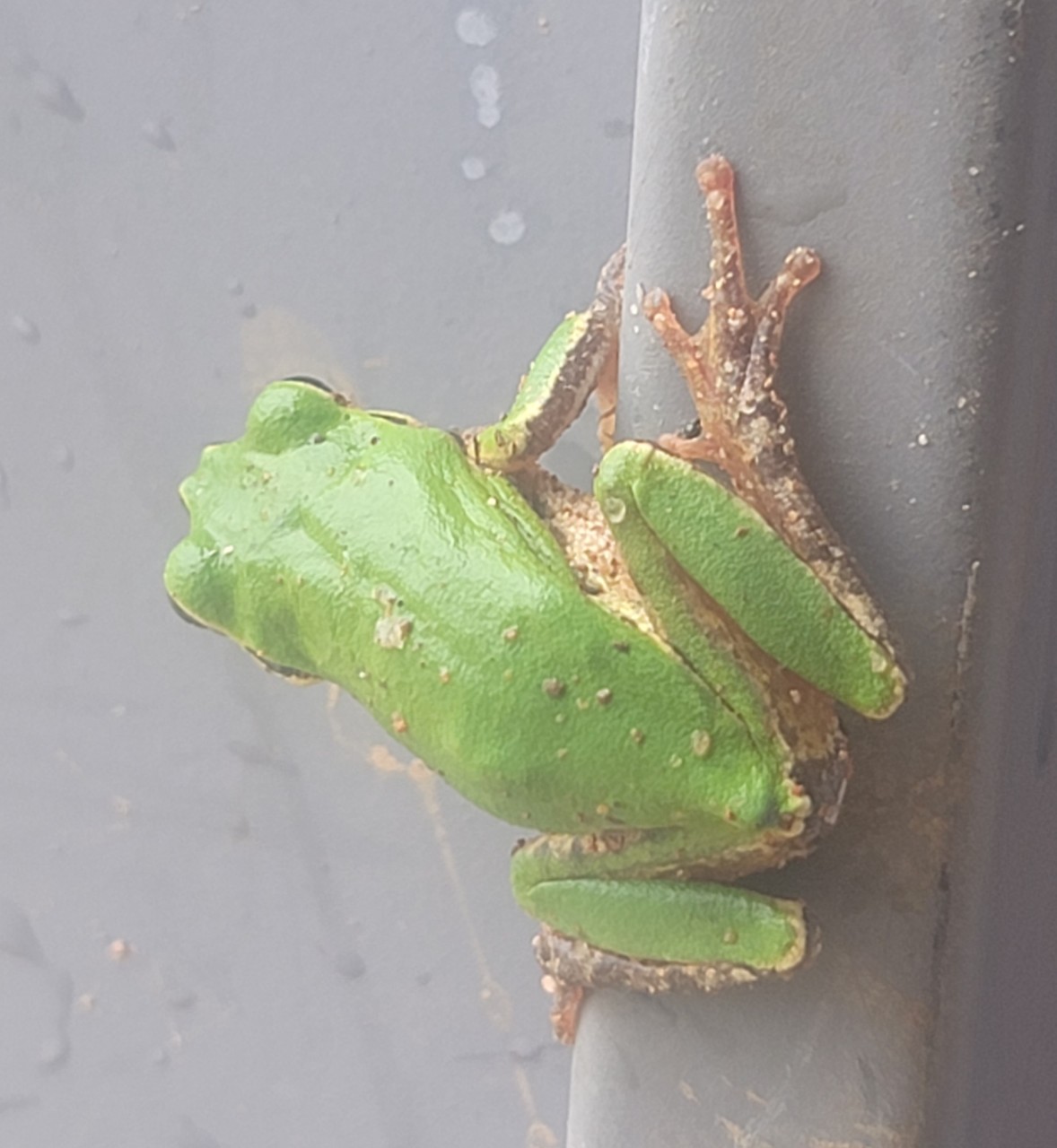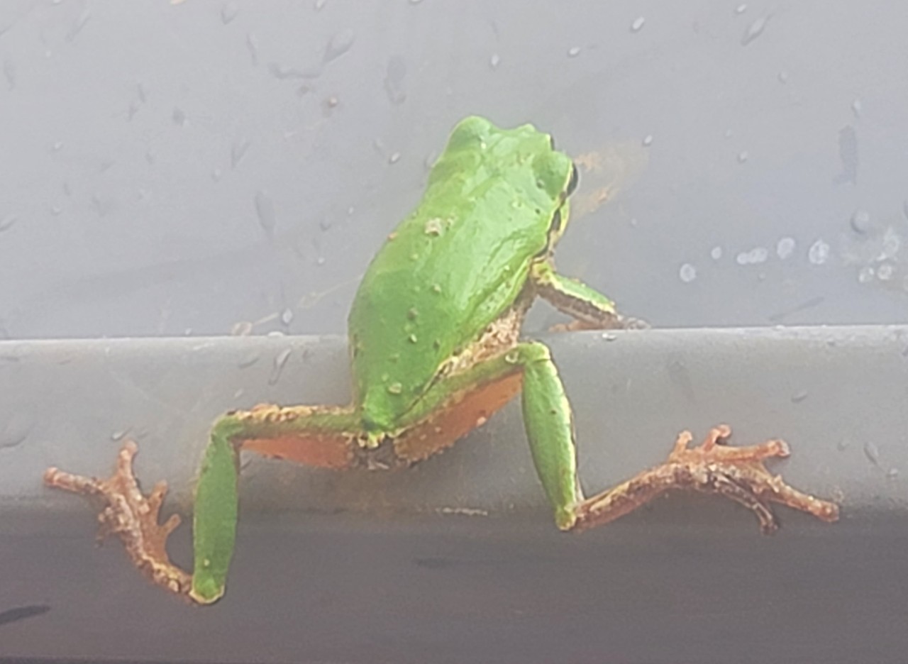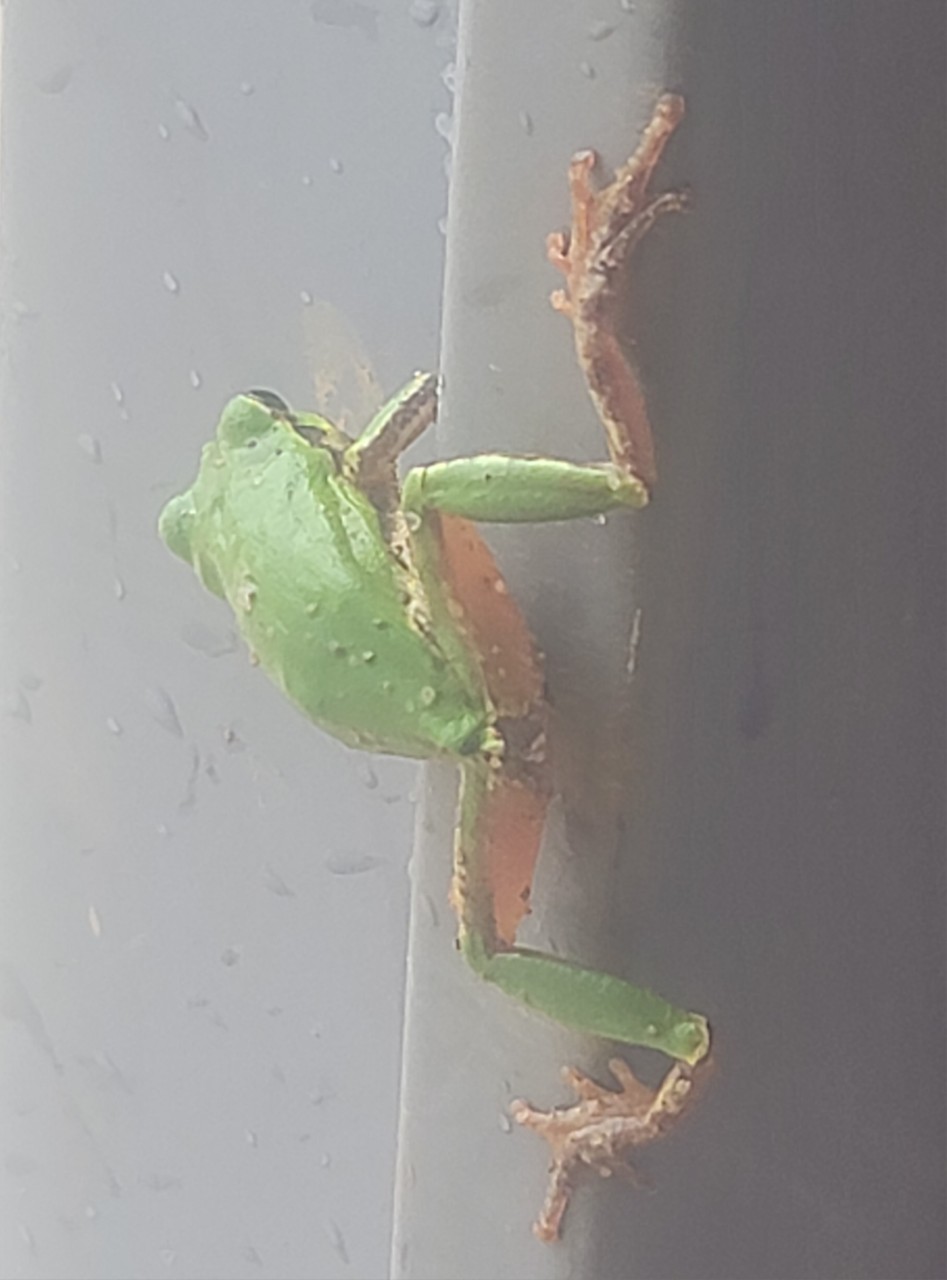 전북 고창군 고창읍 내동리 444-1복분자 줄기 결속작업을 하다 소나기가 세차게 내려 농막으로 피신하여 있는데 청개구리가 농막문틀에 붙어 있다. 소나기를 피하면서 무슨 생각을 하고 있을까?